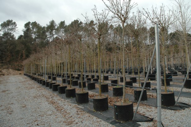 Los avances en la producción de contenedores incluyen la incorporación -la poda de aire para aumentar la biomasa de raíces finas y el crecimiento lateral de los brotes. Los contenedores de poda de aire presentan agujeros que permiten que las bolsas de aire contengan el crecimiento de las raíces dentro del contenedor y eliminen las puntas de las raíces para promover la biomasa y ramificación de las raíces finas . Los recipientes de plástico cilíndricos Air-PotTM (CaledonianTree Company, Ltd., Escocia) utilizan poda de raíces por aire y se han demostrado para minimizar el crecimiento circular de las raíces y otras deformaciones de las raíces en Acer rubrum L. «Florida Flame», Ulmus minor Mill. (syn. Ulmus procera Salisb.), y Tilia cordata Mill. . Los contenedores de tela enterrada (IGF) , desarrollados originalmente por Reiger y Whitcomb, se han modificado y mejorado repetidamente en la producción de viveros a escala comercial. (. Estos recipientes están hechos de tela flexible y algunas veces incluyen una base de polietileno transparente . Los cepellones cultivados en tela enterrada pueden retener la misma densidad de raíces en la mitad del volumen de los cepellones B&B. encontraron que los contenedores de IGF redujeron significativamente el crecimiento de las raíces circulares en varias especies de plantas leñosas en comparación con el stock de CG. Un estudio con Pinus elliottii Engelm de tres años. las plántulas mostraron que los árboles fueron más lentos para establecerse cuando se trasplantaron al suelo como stock de CG que los árboles IGF o B&B . Otro experimento comparó el establecimiento post-trasplante de IGF e Ilex x attenuata producido por B & B Ashe ‘East Palatka’, y los resultados indicaron que las plantas cultivadas con IGF mostraron signos de estrés abiótico y baja actividad fotosintética durante el establecimiento, lo que requiere más riego que los árboles cultivados en el campo después del trasplante
