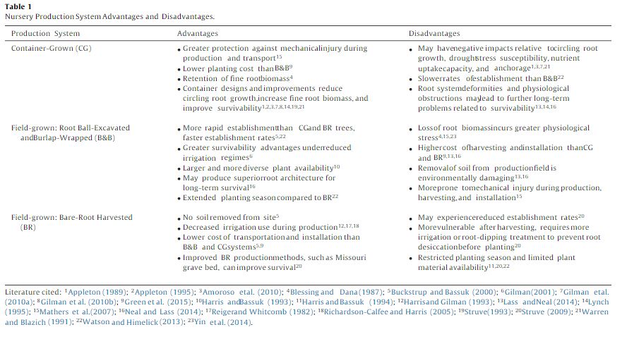 Los sistemas de producción de vivero impactan el desarrollo de la planta y la arquitectura de la raíz, que ofrecen ventajas y desventajas relativas (ver Tabla 1) y pueden influir directamente en la supervivencia de la planta a largo plazo Sin más estudios a largo plazo de supervivencia de los árboles después del establecimiento, es difícil concluir si un sistema de producción dado produce un aumento en la tasa de supervivencia. Los factores que confunden una comparación exhaustiva de cada sistema de producción de vivero incluyen la edad y el tamaño del árbol en el momento de la experimentación, diferentes entornos de crecimiento y diferencias en las respuestas específicas de las especies a los sistemas de producción. El tamaño del stock de vivero utilizado en el trasplante tiene un efecto en la tasa de establecimiento, y varios estudios han demostrado que los árboles más pequeños se establecen más rápidamente que los árboles más grandes, como lo discutió Watson .
