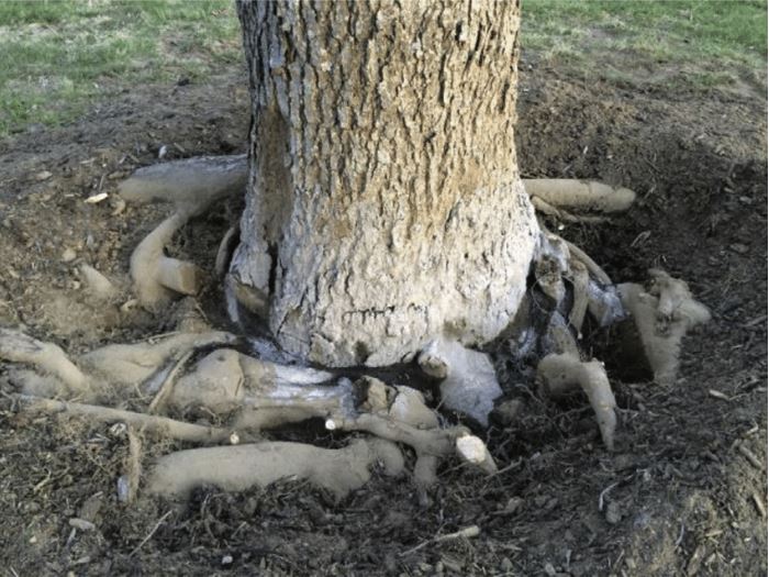 Las raíces que cortan el tallo conducen a estructura del árbol y defectos fisiológicos que pueden afectar la supervivencia del árbol . Aunque es más probable que los árboles cultivados en contenedores desarrollen raíces circulares a medida que las plantas maduran, se ha encontrado que las raíces que cortan el tallo no necesariamente continúan creciendo circunferencialmente después de la plantación.. Varios factores pueden influir en la formación de raíces que cortan el tallo , pero la profundidad de siembra (entierro del collar de la raíz) se ha documentado como un factor contribuyente primario (ver Fig. 4) . El desarrollo de la raíz que rodea el tallo en A. rubrum ‘October Glory’ aumentó del 14% (± 19%) del tronco rodeado circunferencialmente por las raíces de los árboles de control al 48% (± 29%) cuando se plantaron las raíces 15 cm por debajo del grado, y la cobertura de la raíz del cinturón del tallo aumentó a 71% (± 21%) cuando la plantación fue de 30 cm por debajo del grado . Sin embargo, no hubo una diferencia significativa en Prunus yedoensis Matsum. formación de ceñidor bajo los mismos tratamientos de profundidad de plantación. Se ha demostrado que los contenedores de poda de raíces con aire reducen la aparición de un crecimiento circular de la raíz, aunque no hay evidencia de ningún tipo de contenedor que elimine los defectos de la raíz o produzca una planta con una arquitectura de raíz mejorada, en general.