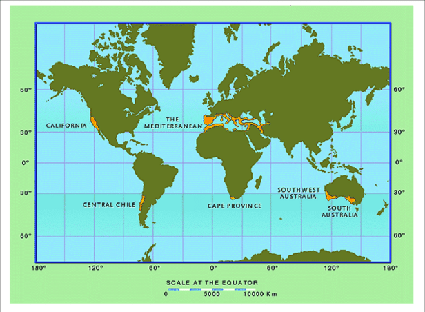 Los ecosistemas de tipo mediterráneo (MTE), con sus regímenes climáticos característicos y únicos de inviernos suaves y veranos cálidos y secos, ocurren en solo cinco regiones del mundo: California; Chile central; la cuenca mediterránea; la región del Cabo de Sudáfrica; y el suroeste y el sur de Australia