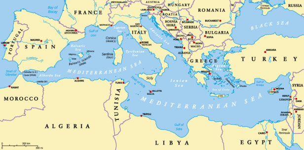 Los países que rodean el Mediterráneo en el sentido de las agujas del reloj son España, Francia, Mónaco, Italia, Eslovenia, Croacia, Bosnia y Herzegovina, Montenegro, Albania, Grecia, Turquía, Siria, Líbano, Israel, Egipto, Libia, Túnez, Argelia y Marruecos; Malta y Chipre son países insulares en el mar