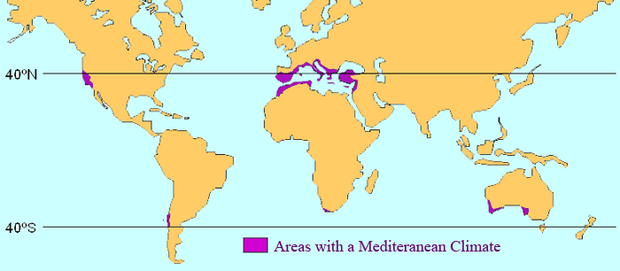 El clima mediterráneo se caracteriza por el verano seco y caluroso y el invierno frío y lluvioso. Las regiones están ubicadas en las partes occidentales del continente entre 30 y 45 grados al norte y al sur del ecuador. La zona climática está vinculada a los cinco grandes cinturones subtropicales de alta presión de los océanos.
