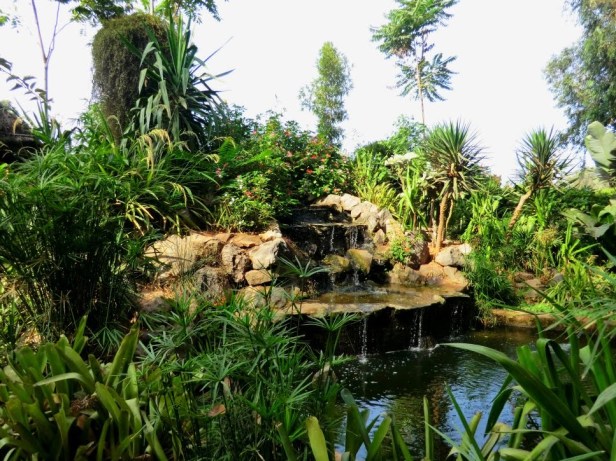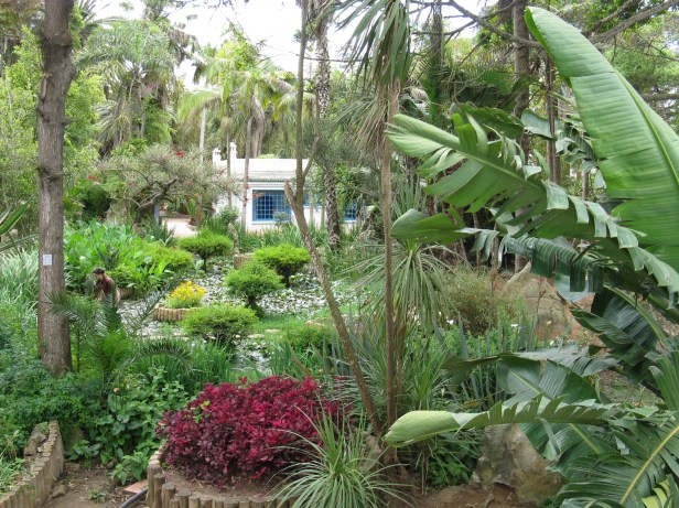 Nuevamente, este jardín sirve como un paso de transición entre dos jardines con diferentes atmósferas. Por lo tanto, es una fase de preparación para la caminata en lugares donde el aspecto natural y «salvaje» es más dominante. Entonces, desde este jardín, ingresamos al jardín polinesio por una pendiente bastante empinada. Durante esta etapa, caminamos sin repetir las dos primeras caminatas. Entonces, cuando cruzamos el puente de losa, subimos una suave pendiente que conduce al sinuoso camino a través del valle que es atravesado por un puente de concreto con un arco muy alto. En el fondo de este valle, hay curiosos ríos rocosos que desenrollan sus sinuosidades. Y en las laderas hay plantas de alfombra que forman una admirable composición paisajística con los troncos de los árboles y las masas espesas de los arbustos. Así que dejamos el hermoso jardín chino y entramos en el jardín del sur de Asia, pero esta vez, sin caminar porque el circuito nos lleva directamente al jardín de las Antillas.