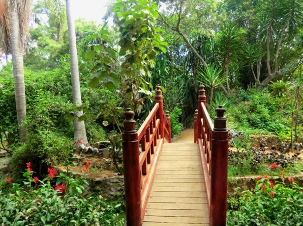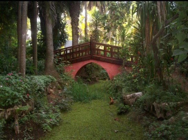 Solo puede ser el espacio donde hay un gran estanque con contornos irregulares, bancos cuidadosamente formados, donde las piedras que parecen haber sido colocadas allí por la naturaleza están dispuestas en montones. Los bordes están bordeados de bambú, árboles y muchas plantas pantanosas que se reflejan en la superficie del agua. Continuando nuestro circuito alrededor del estanque, nos encontramos a un puente de bambú que cruzamos para llegar a una pequeña colina que recuerda a una isla donde se plantan algunas palmeras que invenciblemente atraen nuestra mirada . Desde esta isla, otro puente de bambú conduce al otro lado del estanque. Este puente ofrece una excelente vista del jardín. Descubrimos una cabaña, construida sobre pilotes a unos dos metros del agua. También hay un cuerpo de agua que se caracteriza por una mezcla de plantas acuáticas que contienen una hermosa floración en varios colores. Estos colores constituyen una composición maravillosa en asociación con las flores de temporada que se plantan en cestas de piedras con las que se esparce el estanque. Después de atravesar este camino, el caminante llega a la otra orilla del estanque, donde se desciende una pendiente empinada que está arqueada por las copas de los árboles gigantes, así como por el aspecto enredado de las lianas que cubren los troncos de los árboles. Este descenso conduce, sin duda, al jardín japonés.