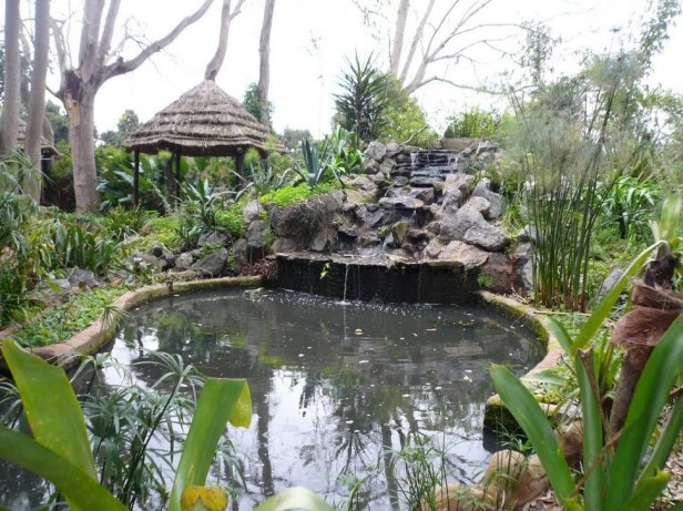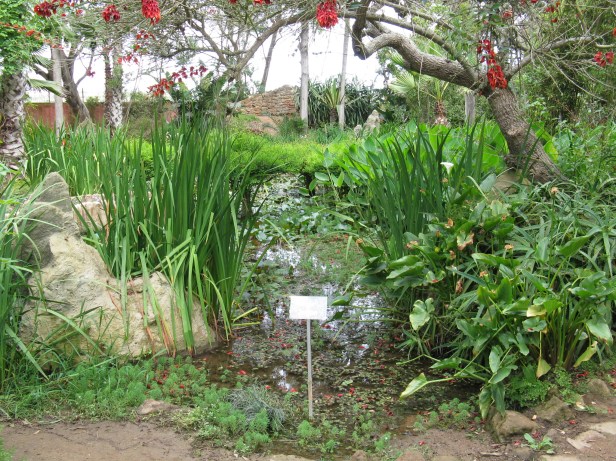 Estos son grandes macizos Crinum que crean un encanto natural. Además, otras plantas únicas echan raíces y trepan a los troncos de los muchos árboles y palmeras. Al dar algunos pasos adicionales, el caminante llega a las orillas de un estanque donde el papiro forma un borde de vegetación coronado con sombrillas claras y donde las otras plantas de las marismas constituyen macizos de flores muy grandes. En la superficie del estanque, hay muchos nenúfares que florecen durante el verano. Este estanque es aún más notable que el lugar donde reina la luz, reflejada por el agua y los nenúfares o por los parasoles de papiro. Ofrece un brillo deslumbrante después de cruzar lugares oscuros, maleza y cuevas.