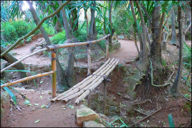 Un personaje estructurado y dinámico Para acceder a este jardín, debe pasar por debajo de una bóveda y tomar un puente de bambú que crea cortes visuales transversales y es un hito muy importante en el paisaje. Este jardín contiene muchas especies de plantas resistentes a la sequía. Son principalmente los arbustos y suculentas los que constituyen una variación notable en la ruta por su gran representación cuantitativa que hacen que su apariencia sea atractiva. Continuando nuestro camino hacia la izquierda, encontramos otro puente de bambú que cruzamos para visitar la otra parte de este jardín donde hay un camino que sube imperceptiblemente en espiral y que se vuelve más estrecho a medida que nos acercamos. de un puente muy rústico. Continuando nuestra caminata en este jardín, descubrimos que principalmente los arbustos y las suculentas animan el curso con su carácter arquitectónico y dinámico.