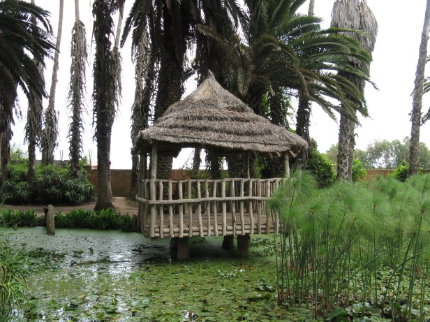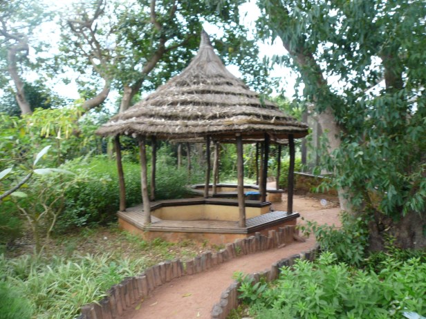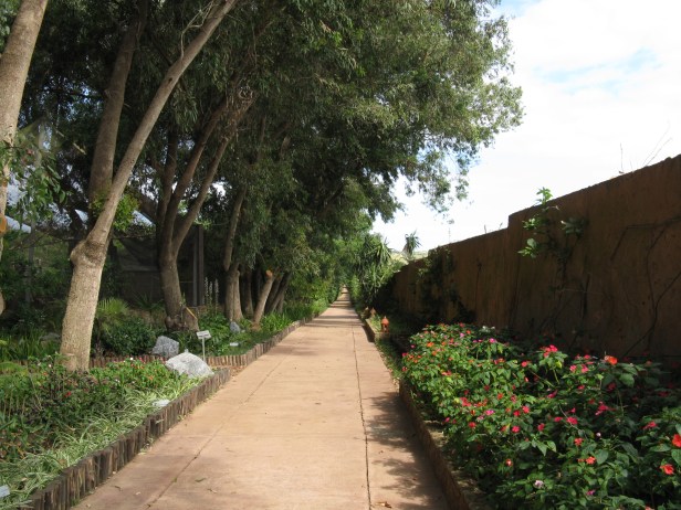 En este lugar, encontramos características típicas de África, como los tótems fijados verticalmente a lo largo de bambú y una caja ubicada en una colina, con techo de paja, paredes hechas de Bambú trenzado y una escalera para acceder. Estos dos elementos se mezclan con la composición vegetal que conforma este jardín. Esta composición contiene inmensos árboles similares a columnas altas cuyas ramas son más distantes y las hojas más pequeñas o cortadas. Esto hace que los rayos del sol brillen en la maleza formada por arbustos y suculentas. Estos últimos están salpicados de claros plantados por macizos de flores. Antes de llegar a este lugar, hay un camino recto bordeado en el lado izquierdo por una alineación de árboles (eucalipto, ficus, schinus) que crea una sombra densa por sus cumbres muy extendidas. Su lado derecho está bordeado por un seto (Hibiscus, Lycium) que se caracteriza por flores y frutos de color escarlata. En la base de este seto, hay una hilera de Aloe con flores espectaculares.