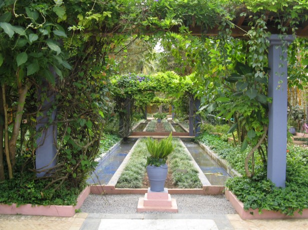 Después de atravesar este jardín donde el rigor del diseño es sorprendente y donde reina la profusión de colores y olores de las plantas bajo estallidos luminosos, el caminante pasa al jardín chino que tiene otro aspecto. Esta parte tiene la forma de un cuadrado, cuyo centro está marcado por una cuenca que comprende en su centro una pequeña isla formada por la superposición de dos maceteros circulares plantados con una palmera de flores y plantas exuberantes. Esta es la isla encantada, el paraíso perdido. Los parterres que rodean la cuenca están plantados con flores. Vuelven varios colores. El rojo, sinónimo de vida y alegría, domina; blanco, símbolo de pureza, refleja luz; el amarillo recuerda el color del sol, de la luz y hace pensar en la alegría; El azul, el color del mar, es fresco, claro y transparente. Todos estos colores recuerdan la claridad y transparencia de los jardines islámicos. El paseo en esta parte del jardín se realiza a lo largo de un camino resaltado por los parterres que rodean el estanque y por maceteros plantados con una mezcla de flores de temporada y plantas perennes y trepadoras. Estos últimos forman cascadas contra las paredes de los plantadores. Después del rigor del diseño y la profusión de las plantaciones, el caminante se encuentra frente a un pontón de bambú. Es un pasaje suspendido entre los árboles. Cuando cruzas este camino, estás casi a la misma altura que los árboles; entonces nos separamos del suelo. Por lo tanto, seguimos mirando nuestro camino y olvidamos el horizonte.