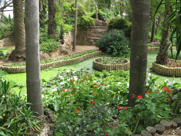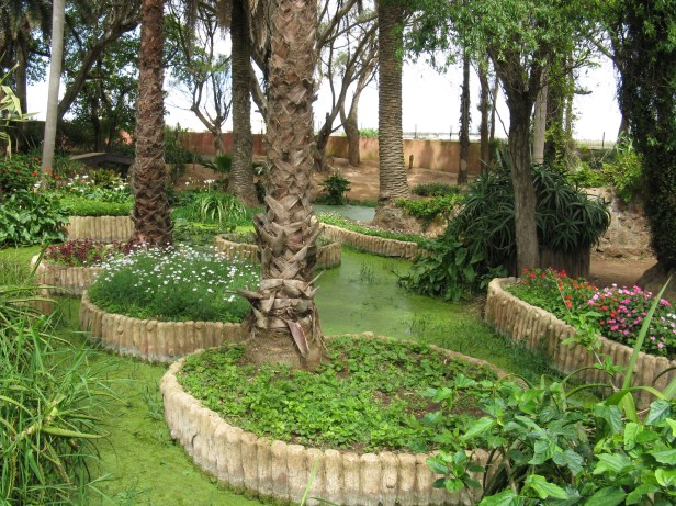 Un ambiente fresco y luminoso Este jardín, de forma alargada, contiene una sucesión de estanques conectados por arroyos estrechos. Estos últimos se cortan en ambos lados regularmente por montones de rocas que se constituyen como puertas. Los bordes de estos estanques y arroyos están bordeados de plantas de alfombra y otras plantas verdes. Caminar en este lugar es prácticamente fácil, porque uno circula solo alrededor de cuerpos de agua y entre las puertas formadas por los montones de rocas. En este jardín hay una oscuridad total causada por los arcos de los grandes árboles que bordean las orillas de las superficies de agua y por el color oscuro de las rocas. Así que este lugar es fresco en comparación con el jardín japonés que está bien expuesto a los rayos del sol. Desde el verde barranco, entramos por una pendiente bastante empinada hasta la segunda parte del jardín andaluz.