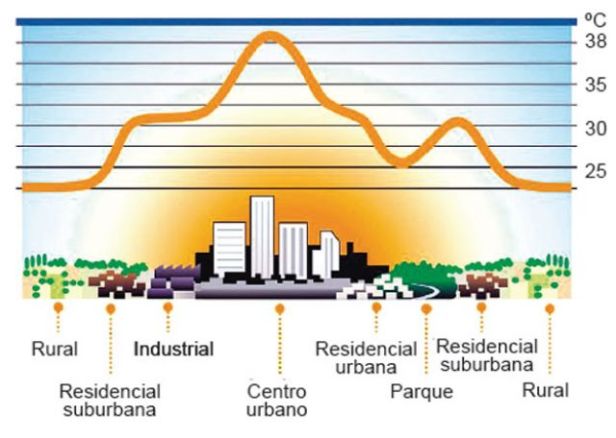 Muchas áreas urbanas y suburbanas presentan temperaturas más elevadas que aquellas zonas rurales adyacentes, esta diferencia de temperatura es lo que se conoce por isla de calor urbano. La media anual de la temperatura de una ciudad de un millón de habitantes puede ser de 1º a 3º C más altas que las que se registrarían en sus alrededores, pero en una noche clara, con vientos en calmas esta diferencia de temperatura puede alcanzar hasta los 12º C. Incluso en ciudades más pequeñas pueden experimentar estos fenómenos (Domínguez, 2002), aunque este efecto es proporcional al tamaño de la ciudad.