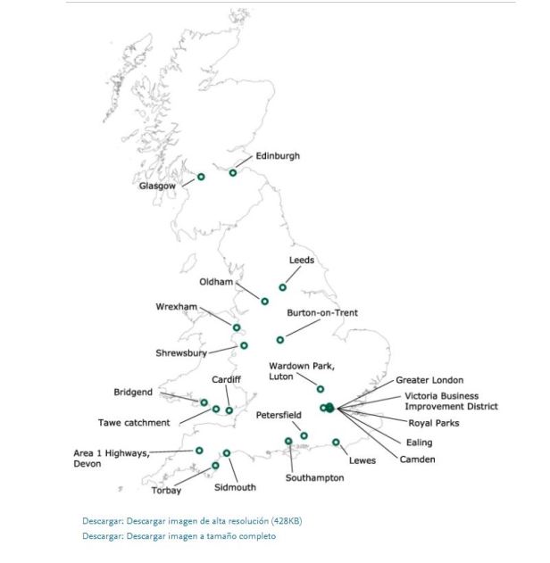 - Entre sectores como empresas privadas, el sector de la salud, universidades, escuelas, grupos locales de interés ambiental y organizaciones específicas como Áreas de Belleza Natural Excepcional (AONB), la Agencia de Carreteras e Investigación Forestal (instituto de investigación del sector público en GB).