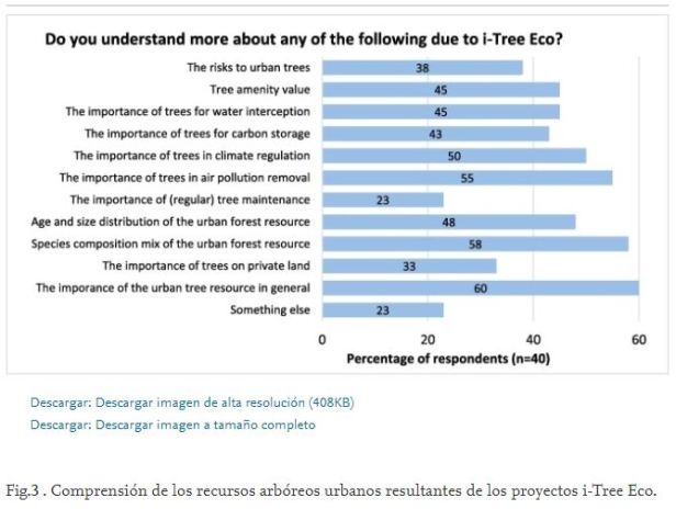 Los resultados del cuestionario en línea revelaron que el 60% (n = 31) de los encuestados tenían una mejor comprensión de la importancia de los árboles en las zonas urbanas y un mayor conocimiento sobre el recurso de los árboles urbanos debido a la encuesta i-Tree Eco. Las tres áreas principales donde la comprensión personal había aumentado fueron: