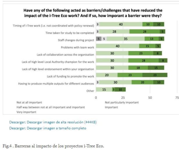 El estudio de evaluación de impacto también exploró las barreras que pueden haber reducido los impactos de los proyectos i-Tree Eco. Se pidió a los encuestados en línea que calificaran la importancia de una variedad de posibles barreras. La falta de fondos para promover el trabajo se enumeró como muy importante (23%, n = 9), seguida de una falta de respaldo de alto nivel dentro de su organización (15%, n = 6) ( Fig. 4) El tiempo necesario para emprender un proyecto i-Tree Eco (23%, n = 9), la falta de un líder de alto nivel del proyecto i-Tree Eco (28%, n = 11) y la falta de compromiso entre las diferentes autoridades locales Los departamentos (23%, n = 9) también fueron vistos como barreras importantes para el impacto. Los cambios de personal, los problemas dentro del equipo de entrega del proyecto i-Tree y el momento del proyecto i-Tree Eco, es decir, en relación con, por ejemplo, actualizaciones o cambios de políticas planificadas, estuvieron en algún punto intermedio entre muy importantes y nada importantes. Varios encuestados (28%, n = 11) informaron barreras adicionales bajo ‘otros’, incluido el “ costo de emprender las obras” , la “falta de recursos en el equipo de comisionamiento”, que “i-Tree Eco se ejecutó en paralelo (en lugar de ser parte de) otras evaluaciones de árboles » , la falta de seguimiento de las actividades después de la publicación del informe, el desafío de cuantificar los servicios de los ecosistemas y la» falta de resolución espacial » para apoyar la interpretación de datos a escala de ciudad pan .