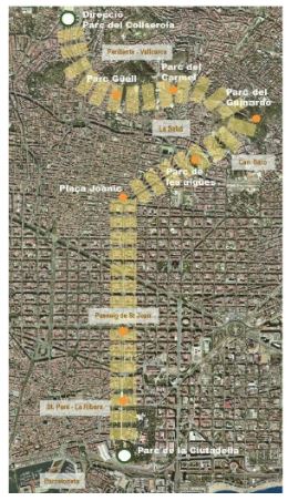 Un corredor verde en la ciudad es una franja continua con presencia dominante de vegetación y uso exclusivo o prioritario de peatones y bicicletas que atraviesa el tejido urbano y conecta con parques urbanos y ecosistemas del entorno. Dentro del corredor Collserola-Ciutadella se encuentra el eje del paseo de San Juan como protagonista.