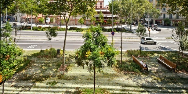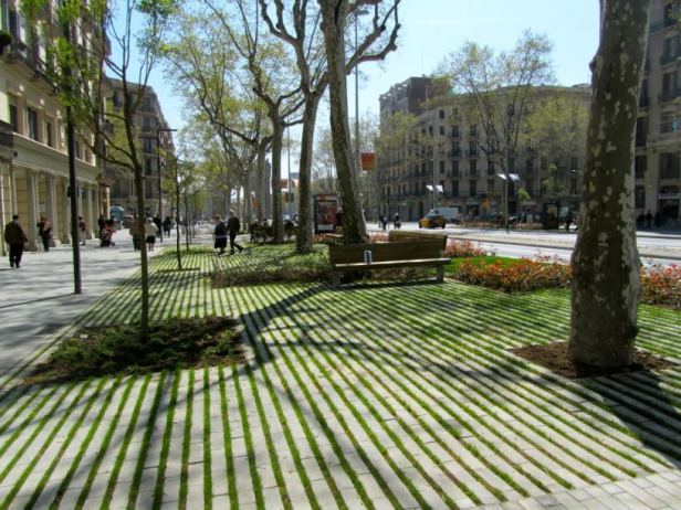 Pero trasladar la atmósfera del Parque de la Ciutadella en el Paseo de San Juan no podía consistir tan sólo en algo superficial y evidente, sino algo de raíz: introducir vegetación limitadamente en parterres y pavimentar todo lo demás con hormigón era una opción mucho más fácil , por supuesto, pero no ha sido el caso. La utilización de un pavimento drenante acompaña la filosofía de ecoeficiencia que se planteaba como punto de partida. No olvidemos que en Barcelona el 64% del suelo está impermeabilizado, lo que dificulta la infiltración de las aguas pluviales.