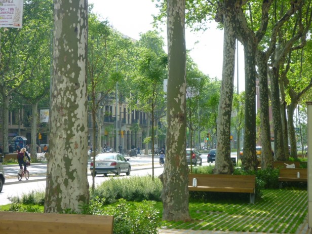 La propuesta continua y coherente con los criterios sostenibles ha evitado que los espacios verdes se conviertan paréntesis urbanos, creando así una capa continua de vegetación y haciendo uso de los parques existentes, el arbolado viario y el potencial enverdecimiento del paseo, reduciendo el tráfico motorizado. Este fue la otra ganancia: se redujeron los carriles rodados dado que el paseo de San Juan estaba sobredimensionado en este aspecto. De los 3 carriles por cada sentido de circulación se eliminaron uno por lado, dejando un carril de circulación y uno para bus en cada banda.