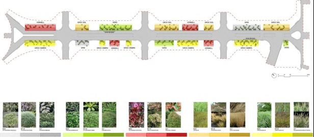 Se incorporaron todo un sistema de arbustivas autóctonas para contribuir a enriquecer la biodiversidad y el subsuelo. La idea era plantear 3 tipologías en altura, dependiendo de la proximidad a la calzada, y 3 tipologías cromáticas, para ofrecer variabilidad visual al conjunto.