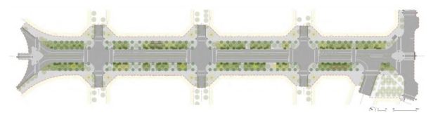 La implantación define un eje de circulación longitudinal peatonal de 6 m de ancho que discurre adyacente a la fachada de los edificios, y en la que se alinean los pasos de cruces de las calles transversales. Entre este eje y la calzada se organiza una faja con diferentes tratamientos de espacios verdes y zonas de estancia. Para la circulación rodada se ha priorizado el carril bus junto a la línea de calzada, por lo que se ha desplazado el carril bici al eje del vial, con carácter segregado, y aprovechando también para incorporar rastros de vegetación . Las zonas de aparcamiento y carga-descarga se organizan en las esquinas, reservando sólo en los bordes de la calzada las interferencias correspondientes a los pasos de peatones, las paradas de autobús, o eventuales servidumbres de acceso rodado por la acera