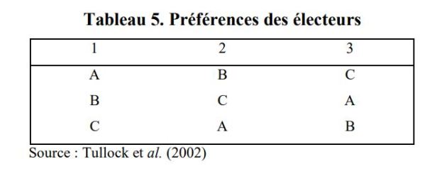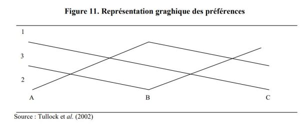 Cuando el proyecto C se opone al proyecto A, C prevalece. Entonces, si C se opone a B, B gana. Este caso ilustra la paradoja de la votación. Cada alternativa se puede elegir de acuerdo con el orden en que se ofrecen las opciones. El resultado de la votación es cíclico y depende de cómo los tomadores de decisiones públicas presenten las opciones. Por lo tanto, Condorcet sugiere que se elija una alternativa solo si tiene la mayoría en contra de cada alternativa.