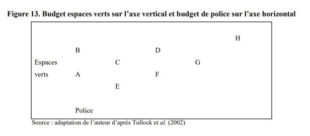Los límites del modelo de votante mediano están vinculados a sus hipótesis restrictivas expuestas anteriormente, en particular las relacionadas con la naturaleza unidimensional del espacio de elección. De hecho, el razonamiento se vuelve complicado si los votantes están interesados en diferentes temas, lo cual es una situación más cercana a la realidad. Adaptamos el ejemplo propuesto por Tullock et al. (2002) 2 a espacios verdes. En la Figura 13, los puntos A a H representan los puntos ideales de ocho votantes para combinaciones de gasto en espacios verdes y gasto policial. La satisfacción de cada votante disminuye si la política implementada se aleja de su punto de preferencia. Como no hay equilibrio, los partidos políticos proponen un conjunto de medidas para obtener el voto de tantos votantes como sea posible (Black, 1948; Tullock et al., 2002)