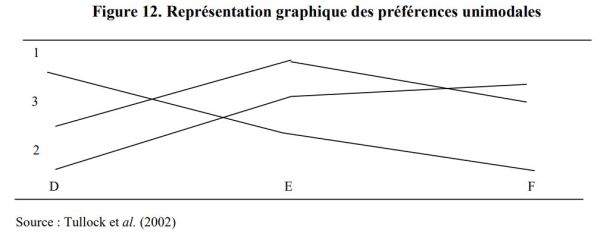Esto da como resultado el teorema de preferencia mediana. Para que se verifique, se debe respetar la condición de las preferencias unimodales («preferencias de un solo pico») : las preferencias deben disminuir monotónicamente a medida que uno se aleja del pico de preferencia. Esto evita la paradoja de Condorcet e identifica la preferencia media.