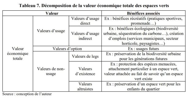 Por ejemplo, ¿cómo disociar el valor de existencia de un espacio verde de su valor de uso indirecto? Si un individuo no puede hacer esta distinción, ¿cómo es más el economista? Incluso si no hay consenso en torno a la medición del TEV de los bienes ambientales, el concepto tiene el mérito de existir. El valor de los espacios verdes no se reduce a su costo. Tener en cuenta solo los costos de inversión y mantenimiento no compara su valor con otros bienes para los que existe un mercado. Al introducir el concepto de utilidad, la economía neoclásica permite reflejar la raíz del problema: el valor de los espacios verdes no solo está vinculado al costo de los factores de producción porque satisfacen las necesidades humanas en términos calidad de vida