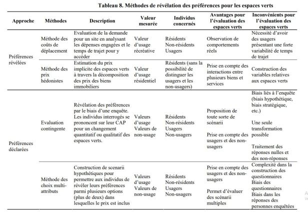La Tabla 8 enumera los diferentes métodos de evaluación aplicables a los espacios verdes. Estos métodos permiten obtener las preferencias individuales. Cada uno de ellos tiene sus límites teóricos o empíricos que no discutiremos aquí (cf. Freeman, 2003). Preferimos especificar lo que cada uno puede aportar para la evaluación de espacios verdes. Por lo tanto, presentamos el método, el tipo de valor medido, las categorías de individuos cuyas preferencias, sus ventajas y desventajas específicas pueden estimarse para espacios verdes.
