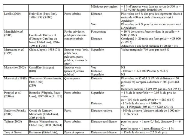Los espacios verdes se capitalizan en los precios de las propiedades, pero en menor medida que ciertas características intrínsecas, como la cantidad de habitaciones o la cantidad de baños. Por lo tanto, las personas parecen buscar proximidad a los espacios verdes Para algunos autores, sin embargo, esta capitalización ya no existe desde cierta distancia. Así, en Worcester (Estados Unidos), More et al. (1988) encuentran un umbral de 2,000 pies (610 m). O en Brest (Francia), Ahamada et al. (2008) encuentran un efecto umbral de 200 m.