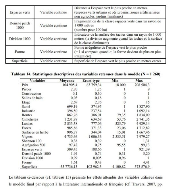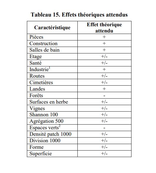 La siguiente tabla (véase la tabla 15) presenta los efectos esperados de las variables utilizadas en el modelo final en comparación con la literatura internacional y francesa (véase Travers, 2007, pp. 379-380). Para las variables de paisaje, dado el pequeño número de estudios que las usan (en particular en áreas urbanas), no podemos determinar un signo a priori.