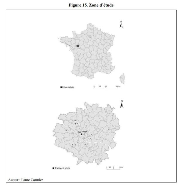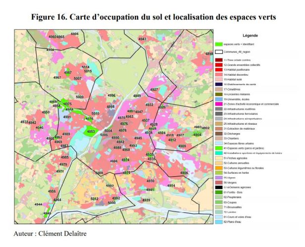 Obtuvimos el plan de uso del suelo de la Agencia de Planificación Regional de Angevine (AURA) 2 para el área urbana de Angers. Este es el resultado de la fotointerpretación de imágenes de satélite y orto fotografías que datan de 2005. La nomenclatura ofrece tres niveles, siendo el nivel 3 el más detallado (ver Anexo 5). Este último enumera 34 tipos de uso de la tierra, incluidos los «espacios verdes (parques y jardines)». La Figura 16 muestra los tipos de uso del suelo según el nivel 3. Los números escritos en la tarjeta son identificadores que indican la ubicación de cada espacio verde.