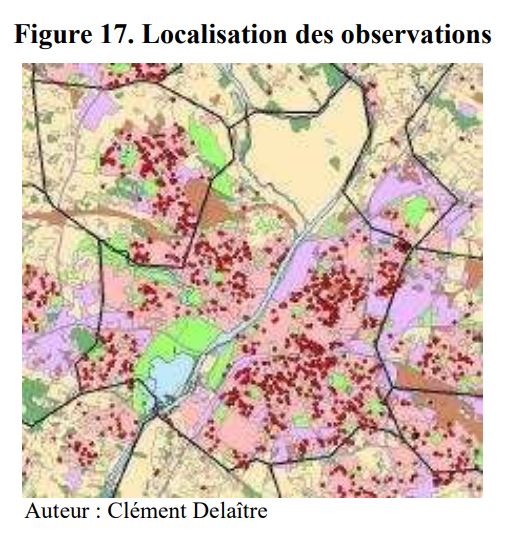 De la sección catastral provista en la base PERVAL (aproximada por su baricentro, ver Figura 17) y el mapa de uso de la tierra AURA, Hemos localizado cada apartamento gracias al uso de un Sistema de Información Geográfica (para más detalles sobre SIG, consulte el apéndice 6). Desde esta ubicación, podemos calcular las distancias euclidianas para las diferentes características del plan de uso del suelo. En teoría, la distancia se puede medir de varias maneras (cf. Huriot y Perror, 1990). Es razonable pensar que las distancias de la carretera o las distancias para caminar pueden influir en las opciones de ubicación residencial. Por ejemplo, Kong et al. (2007) utilizan el criterio de distancia a pie expresado en minutos. O habría sido interesante considerar la distancia en número de calles divisorias entre las viviendas y los espacios verdes. Sin embargo, debido a los datos disponibles, este cálculo no es posible