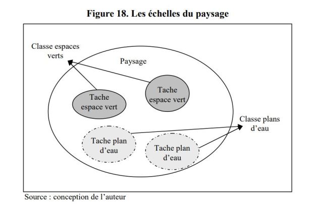A partir del mapa de cobertura del suelo, en el que se georreferencian las observaciones, se calculan diferentes métricas del paisaje en tres niveles: paisaje («paisaje»), clase («clase») y el parche (ver figura 18). Los indicadores calculados a nivel del paisaje global caracterizan la morfología y la distribución espacial de todos los tipos de uso de la tierra. Por ejemplo, proporcionan información sobre la diversidad de tipos de uso de la tierra dentro de un determinado radio. Los indicadores calculados a nivel de clase describen la distribución y la morfología de cada tipo de uso de la tierra (por ejemplo, la clase «espacios verdes» corresponde al tipo de «espacios verdes» de uso de la tierra e incluye todos los manchas «espacios verdes»). Finalmente, los indicadores calculados al nivel de cada punto caracterizan cada polígono de acuerdo con índices de forma, regularidad, alargamiento o incluso estrechez (por ejemplo, un punto es un espacio verde o un cuerpo de agua). La ventaja de distinguir entre estos tres niveles es que un análisis a nivel de paisaje mediante la agregación entre clases conduciría a una pérdida de información (Napoleón, 2005)