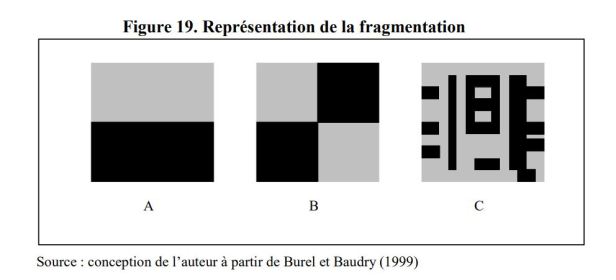 También se calculan las áreas de ciertos puntos, como el área del espacio verde más cercano a cada apartamento. El conjunto de indicadores calculados se presenta en el Apéndice 7. Estas métricas del paisaje nos dicen si el paisaje alrededor de una observación tiene muchos tipos diferentes de uso de la tierra (índice de Shannon), si el paisaje es bastante heterogéneo ( de estilo mosaico), si los tipos de uso de la tierra son mixtos, pequeños, agregados, etc. Dada la amplia gama de indicadores de paisaje, no podemos describirlos exhaustivamente1. Sin embargo, presentamos un ejemplo: fragmentación. Esta noción está vinculada al tamaño de las manchas. La disponibilidad de espacios verdes se puede medir por su superficie total o por su superficie ponderada por el número de espacios verdes. La fragmentación permite evaluar su distribución espacial. ¿Los espacios verdes están organizados en puntos grandes o pequeños? La Figura 19 muestra diferentes niveles de fragmentación en un espacio compuesto por edificios (representados en gris) y espacios verdes (representados en negro). En la Figura 19.A, los espacios verdes no están fragmentados, mientras que en la Figura 19.C, están muy fragmentados. La fragmentación es un criterio interesante porque la sensibilidad de la población a la fragmentación de los espacios verdes depende de su radio de movimiento diario (Burel y Baudry, 1999).