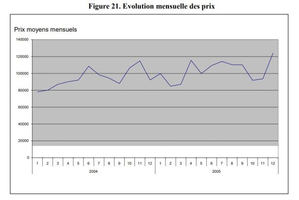 Debido a la evolución de los precios inmobiliarios, para hacer un análisis en igualdad de condiciones, debemos tener en cuenta esta evolución. Hay dos opciones: la primera es incluir en el modelo econométrico una variable indicadora para cada año; el segundo en usar un deflactor de precios. La Figura 21 muestra que los precios promedio de los apartamentos aumentaron entre 2004 y 2005. Además, la prueba de igualdad de medios rechaza la hipótesis nula de igualdad de medios entre estos dos años (ver Anexo 8). Esta diferencia en el precio promedio se puede vincular a una muestra diferente entre los dos años (de características diferentes), es decir, un cambio en los precios.