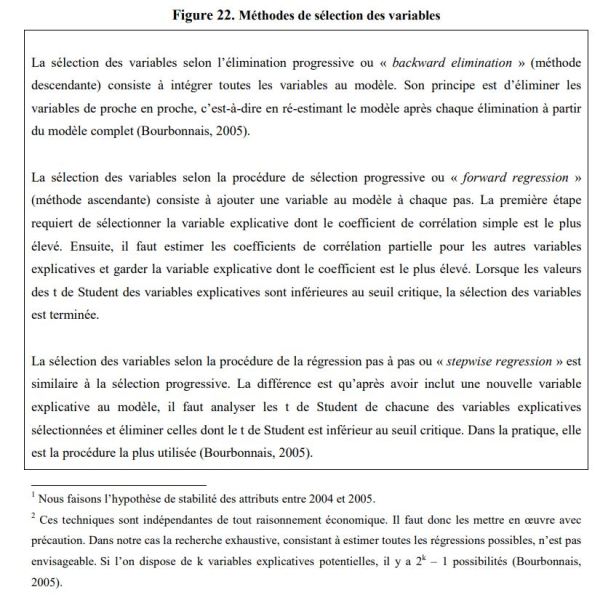 Nos enfrentamos a la elección entre muchas variables explicativas para explicar la variación en los precios de los apartamentos. Existen diferentes técnicas estadísticas para determinar las variables relevantes a incluir en el modelo. Debido a la gran cantidad de variables y la existencia de fuertes correlaciones entre algunas, procedemos a una selección de las variables de acuerdo con un procedimiento paso a paso, el método de abajo hacia arriba y el método de arriba hacia abajo (véase la Figura 22).