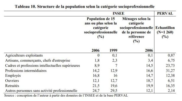 La Tabla 10 presenta la estructura de la población según la categoría socioprofesional (CSP). Observamos que dentro de nuestra muestra, algunos CSP están sobrerrepresentados, en particular artesanos, comerciantes, empresarios, ejecutivos y profesiones intelectuales superiores y profesiones intermedias. Esto parece coherente, ya que es probable que estas personas tengan mayores ingresos4 y, por lo tanto, sean más inclinado a adquirir bienes inmuebles. Esto implica que nuestros resultados no serán representativos de toda la población angevina per se, sino que estarán sesgados a favor de CSP más altos.