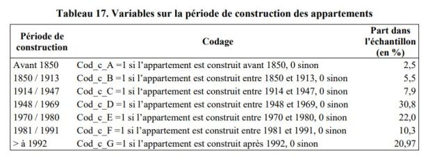 por lo tanto, nuestros instrumentos están correlacionados con el término de error de la función de precio hedónico . Para resolver este problema, por lo tanto, elegimos hacer las estimaciones de la función del precio hedónico en una submuestra para la cual tenemos el período de construcción de la vivienda (ver Tabla 17). De hecho, la introducción de estas variables nos permite identificar instrumentos de «buena calidad» . Luego tenemos una base de 1,016 observaciones, cuyas nuevas variables no están correlacionadas con las antiguas3. Cabe señalar que las pruebas de igualdad de las medias muestran que la estructura de la submuestra no es significativamente diferente de la muestra inicial.
