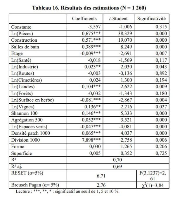 También parece que los hogares residentes prefieren que estos espacios verdes tengan un área más pequeña. Por lo tanto, los hogares prefieren residir en áreas más densas con áreas verdes más pequeñas que en áreas donde el número de áreas verdes es menor pero cuya área es mayor. La forma del espacio verde más cercano no es un criterio significativo en las elecciones residenciales de los hogares. Nuestros resultados también indican que cuando el paisaje se compone de tipos de uso de la tierra (caminos, áreas de césped, espacios verdes, áreas comerciales, etc.) diversificado y distribuido homogéneamente en un radio de 100 y 500 metros respectivamente alrededor El apartamento, el precio de venta de este último aumenta. Incluso si desde un punto de vista teórico, uno pudiera esperar un efecto de la distancia al centro de la ciudad, no aparece en el modelo estimado. Esta variable agrega muchos servicios. Esto explica por qué nuestros resultados indican que acercar los apartamentos al páramo y al viñedo lleva a una caída en el precio promedio de venta.