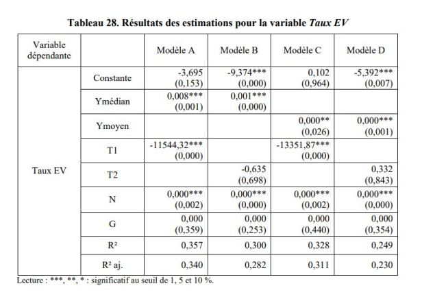 Dados estos resultados, ahora nos enfocamos en la variable de tasa EV. Los dos tipos de dependencia espacial son significativos. Sin embargo, solo la dependencia espacial a través de una variable endógena compensada es significativa sea cual sea la matriz de peso utilizada. Las matrices de peso W1, W4 y W6 no permiten una elección clara de la forma adoptada por la dependencia espacial. Más precisamente, para estas matrices, las pruebas LM y RLM son significativas para las dos formas de dependencia espacial. Por otro lado, cuando la vecindad se define por las matrices de peso W2, W3 y W5, se retiene el modelo con variable endógena desplazada. Para la matriz W3 y W5, la prueba LM es suficiente para seleccionar el modelo relevante, las pruebas no son significativas para el modelo con errores auto correlacionados. Para la matriz W2, la prueba RLM permite elegir el modelo con variable endógena compensada.
