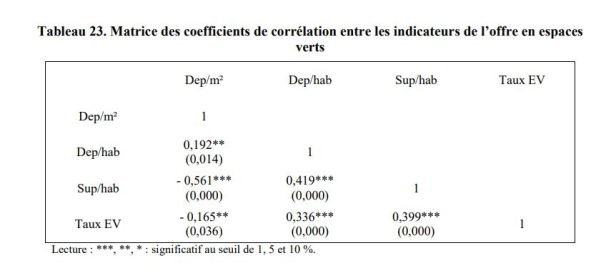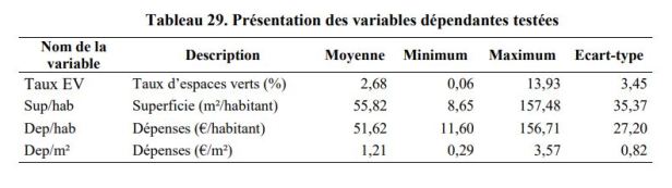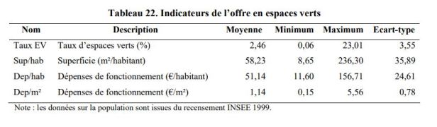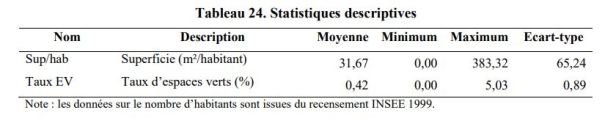 Como señala Hayes (1989) , la mayoría de los autores utilizan el indicador de gasto per cápita por falta de acceso a otra información, ya que las otras medidas del nivel de bien público local a menudo no son observables. Nuestra encuesta nos permite probar y discutir varios indicadores de la provisión pública de espacios verdes. Las diferentes variables que indican el nivel de espacio verde y sus estadísticas descriptivas son las de la tabla 23 presentada anteriormente.