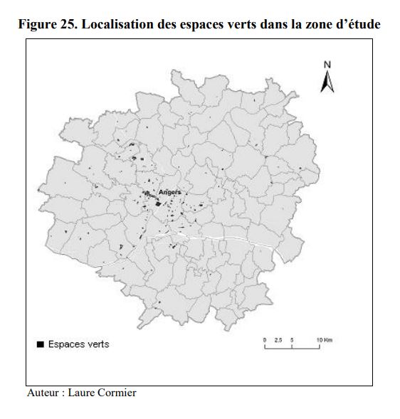 Aunque la encuesta nos proporciona un número relativamente alto de observaciones, es incompleta porque, por un lado, incluye faltan observaciones y, por otro lado, la definición de espacios verdes no es uniforme entre los diferentes municipios de la muestra. Por lo tanto, nosotros ofrecer una alternativa construyendo una base de datos de Sistemas de Información Geográfica (SIG). Usamos el mapa de uso del suelo obtenido de la Agencia de Planificación Urbana de Angers (AURA) . El mapa es el resultado de la fotointerpretación de imágenes de satélite y ortofotos del año 2005. Tiene tres niveles de información. El nivel más detallado contiene 34 tipos de uso del suelo, incluido el tipo de «espacios verdes» (parques y jardines). El mapa cubre 93 municipios en el área urbana de Angers y en el esquema de coherencia territorial de Pays Loire Angers (ver Figura 24). La lista de municipios se presenta en el Apéndice 12. La ubicación de los espacios verdes se presenta en la Figura 25. Su área se extrajo del mapa utilizando el software ArcGis 9.2. La tipología de espacios verdes adoptada por AURA incluye parques públicos y jardines. El uso de SIG tiene tres ventajas sobre la encuesta: tenemos información para todos los municipios en el área de estudio; La tipología de los espacios verdes es uniforme. Se observan las áreas, a diferencia de la encuesta, por lo que puede haber un sesgo en las respuestas obtenidas.