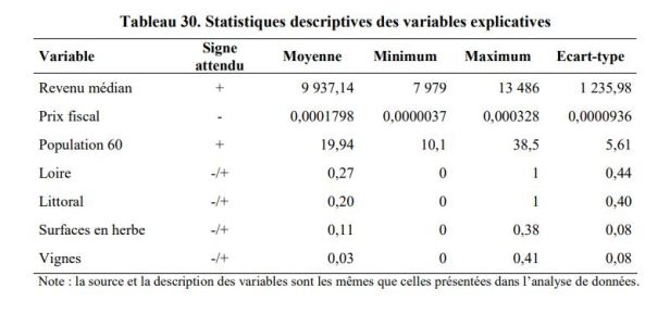 - (v) La proporción de viñedos en el cantón al que pertenece el municipio (Vignes). Esta variable también nos permite capturar posibles efectos de sustitución entre espacios verdes y servicios rurales. Las estadísticas descriptivas de las variables explicativas del modelo final se presentan en la Tabla 30