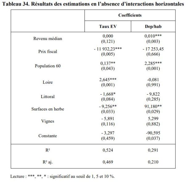 El modelo estimado explica el 46% de la variación en el nivel de espacio verde para la variable de tasa EV. El ingreso medio no es significativo. El precio del impuesto tiene un coeficiente negativo y significativo en el umbral del 1%. La proporción de personas mayores influye positivamente en la provisión de espacios verdes. En cuanto a los servicios paisajísticos, la proximidad del Loira tiene un efecto positivo en la demanda de espacios verdes, mientras que la costa y los pastizales tienen un efecto negativo. El coeficiente asociado con la variable Vines no es significativo. La estimación anterior revela que el modelo elegido para explicar la provisión de espacios verdes es relativamente satisfactorio. Esta observación ya no es válida para el gasto por habitante (Dep / hab). El modelo explica el 21% de la variación en el gasto per cápita. Solo los coeficientes asociado
