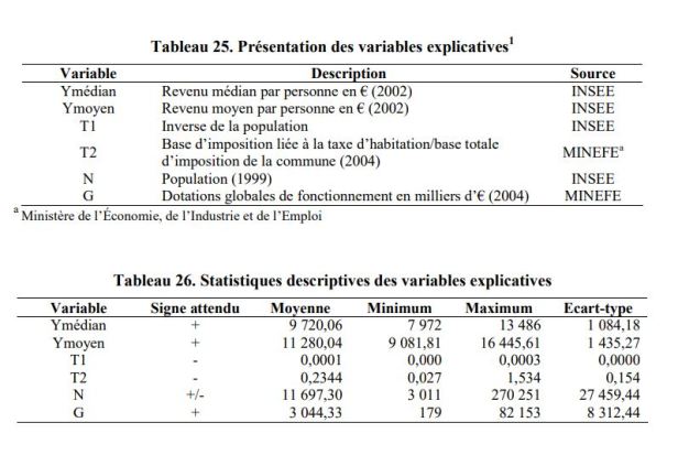 La literatura sobre el modelo de votante medio retiene cuatro variables generalmente probadas a partir del trabajo fundador de Borcherding y Deacon (1972) y Bergstrom y Goodman (1973). Se presentan en la Tabla 25 y sus estadísticas descriptivas en la Tabla 26. Las variables y sus efectos teóricos esperados son los siguientes: