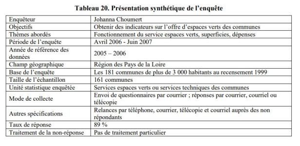Hemos construido completamente una base de datos mediante una encuesta. Esto cubre municipios con más de 3.000 habitantes en la región de Pays de la Loire. Sus condiciones se presentan en detalle en el Apéndice 10. Presentamos el tema de la encuesta, la población de referencia y la elección del modo de recopilación de datos. La Tabla 20 proporciona una presentación resumida.