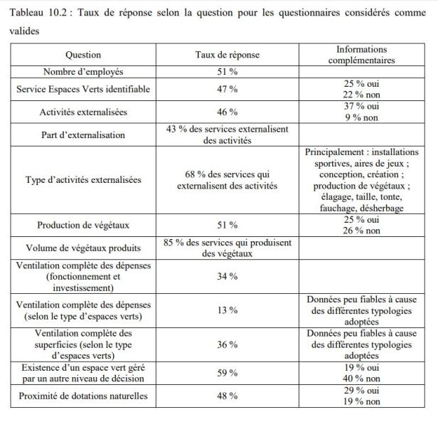 La tasa de respuesta final es de alrededor del 89%. La lista de municipios se presenta en la Tabla 10.3). A pesar de los recordatorios realizados, algunos municipios no respondieron a la encuesta. Se deben retener dos argumentos principales para explicar las no respuestas: el argumento más citado es la falta de tiempo o la voluntad de responder el cuestionario; El segundo argumento es la falta de disponibilidad de la información solicitada, en particular sobre las áreas de espacios verdes gestionados.