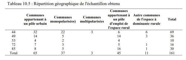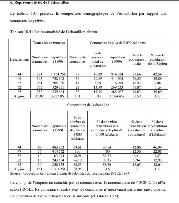 La membresía de un municipio en el alcance de la encuesta está determinada por criterios demográficos y geográficos. La encuesta abarca municipios con más de 3.000 habitantes (según el censo INSEE de 1999) en la región de Pays de la Loire. Las unidades encuestadas son los Servicios del Espacio Verde (o Servicios Técnicos). No entrevistamos municipios con menos de 3.000 habitantes. Esta elección está motivada por el hecho de que los espacios verdes son un fenómeno urbano y no constituyen un problema importante para las comunidades rurales. Las comunidades rurales a menudo no tienen un Servicio de Espacio Verde (o Servicio Técnico). Esta intuición es confirmada por las pruebas preliminares realizadas en varias comunas que revelan que los Servicios del Espacio Verde de las comunas de menos de 3000 habitantes emplean solo una o dos personas (que a veces se asignan a otras tareas, como la red de carreteras ). Además, estos municipios tienen más dificultades para ser encuestados debido a la pequeña cantidad de personal en los servicios municipales.