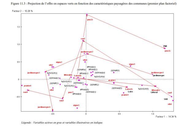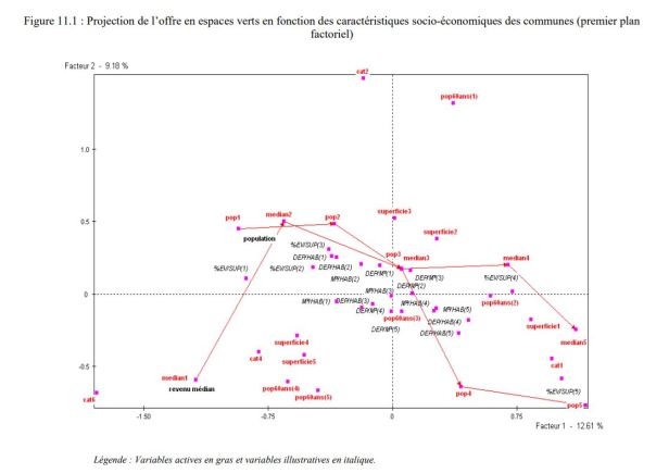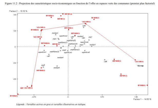 - Anexo 11. Análisis de datos Para caracterizar los municipios y priorizarlos con respecto a la oferta de espacios verdes, realizamos un análisis de factores múltiples (AFM) (cf. Escofier y Pagès, 1998). El objetivo de la AFM es destacar los municipios que son similares, teniendo en cuenta todas las variables. Este método permite identificar los principales factores de variabilidad en la oferta de espacios verdes y describir los municipios que utilizan estos factores. La base de datos sin formato no es homogénea. Contiene variables cuantitativas y cualitativas. Las variables cuantitativas se transforman en clases homogéneas (véase la tabla 11.1). Obtenemos una tabla de modalidades que permiten el uso de un AFM. El análisis de datos se lleva a cabo utilizando el software SPAD.