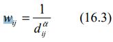 La forma funcional de una matriz de peso refleja la relación entre la distancia y la intensidad de la interacción. Los más utilizados en la literatura sobre interacciones horizontales son la matriz de peso basada en la contigüidad de orden 1 y la matriz de peso basada en la distancia. Los elementos de una matriz de peso basada en la contigüidad están representados por: = 0 de lo contrario, si las observaciones 1 son contiguas de orden k wij (16.1), los elementos de la diagonal son ceros. La forma general de una matriz de peso basada en la distancia es tal que: