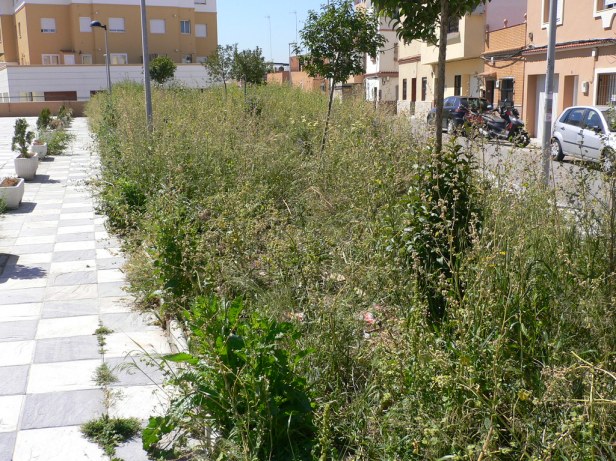 Los lugares muy concurridos, como las plazas y las calles en los centros de las ciudades o las entradas de los pueblos, se desmalezan con mucha frecuencia para no permitir que la vegetación espontánea se asiente.